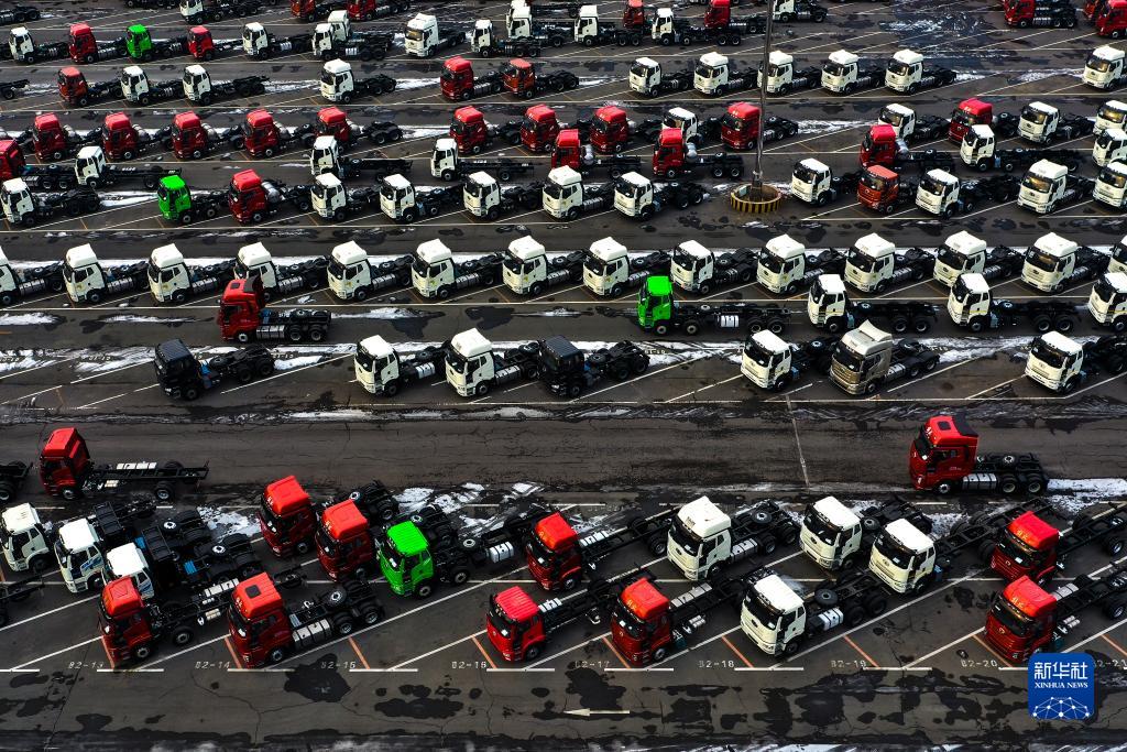 這是1月31日在吉林長(cháng)春拍攝的一汽解放智慧物流公司整車(chē)物流部停車(chē)場(chǎng)內即將轉運交付的車(chē)輛(無(wú)人機照片)。