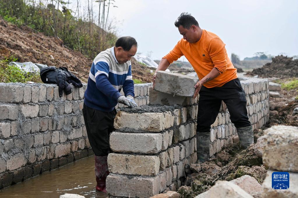 2月1日,廣西興業(yè)縣沙塘鎮的群眾在修筑灌渠。