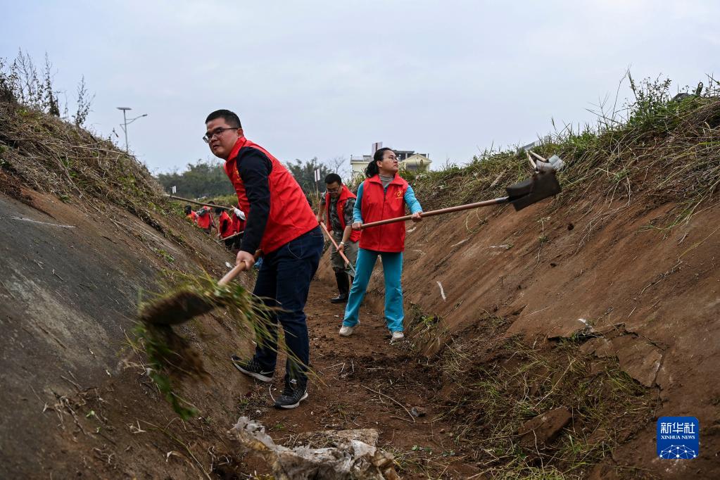 2月1日,廣西興業(yè)縣沙塘鎮的黨員干部群眾一起清理灌渠內的雜物。