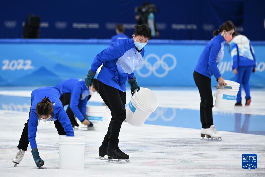 在北京冬奧會(huì )花樣滑冰男子單人滑自由滑比賽結束后,楊曦(中)和其他志愿者一起進(jìn)行冰面修補(2022年2月10日攝)。