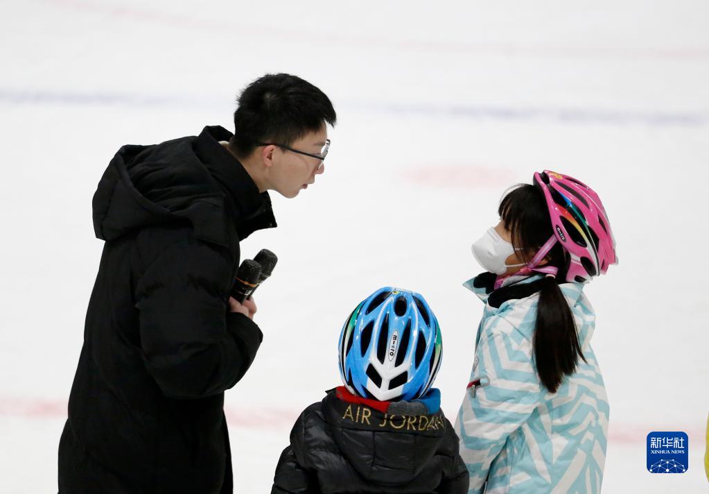 楊曦(左)在滑冰基礎教學(xué)課上聆聽(tīng)兩名小朋友提出的問(wèn)題(1月17日)。