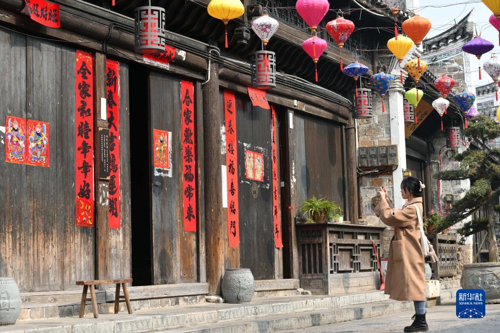 2月1日,游客在舊州古鎮游覽、拍照。