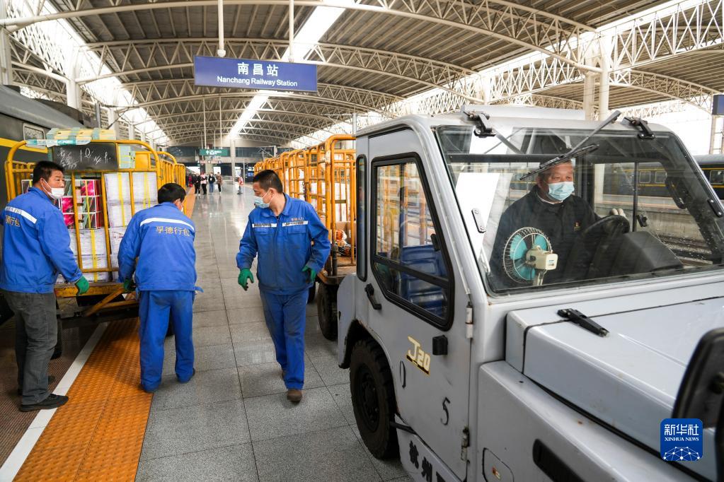 在南昌火車(chē)站站臺,牽引車(chē)司機張細茂等待工人分發(fā)搬運行李包裹(2月1日攝)。
