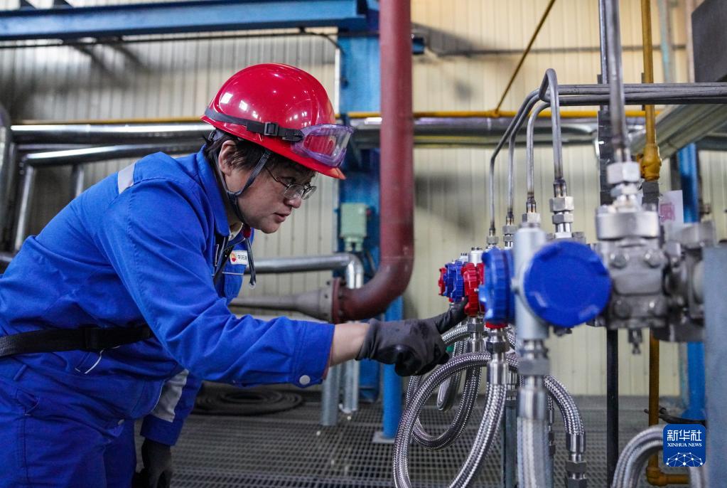 李艷在中國石油吉林石化公司煉油廠(chǎng)車(chē)間內巡檢(2022年11月8日攝)。