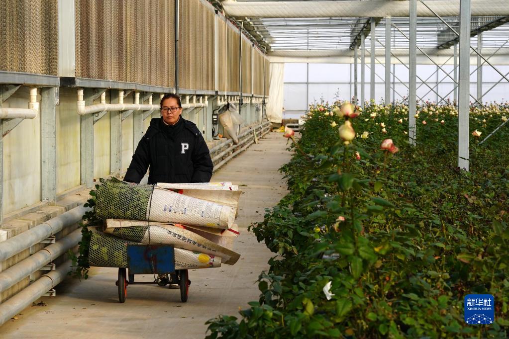 2月1日,村民在河北邱縣盛水灣玫瑰產(chǎn)業(yè)園運輸采收的玫瑰花。