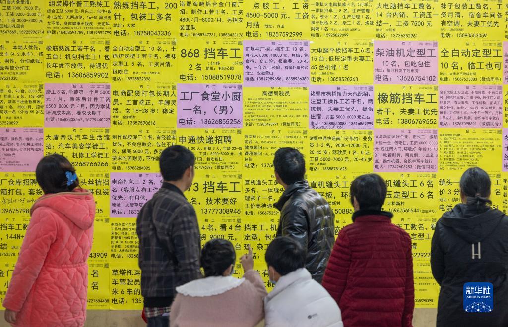 2月1日,外來(lái)務(wù)工者在浙江省諸暨市大唐街道勞動(dòng)力市場(chǎng)內查看招工信息。