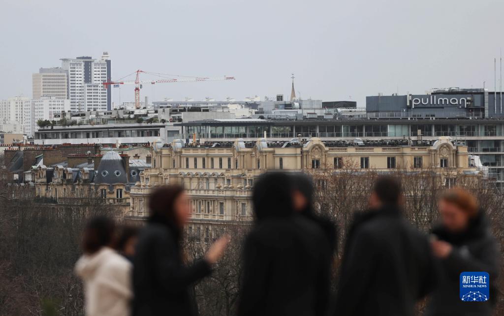 2月1日,人們在法國巴黎望向遠處的建筑和塔吊。