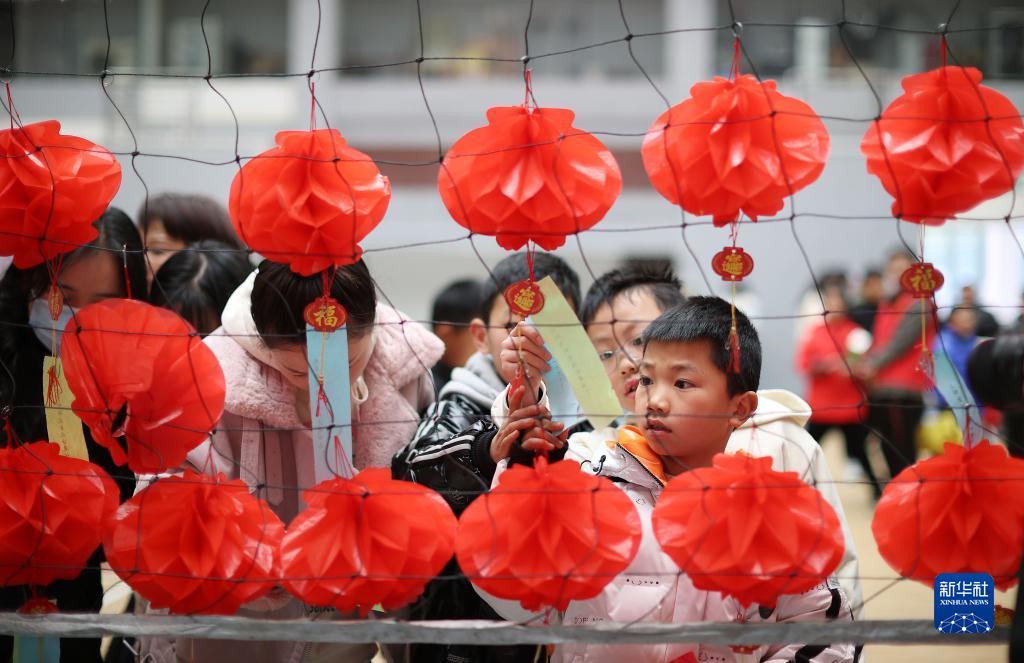 2月2日,貴州省黔東南苗族侗族自治州丹寨縣的小朋友在迎元宵活動(dòng)中猜燈謎。