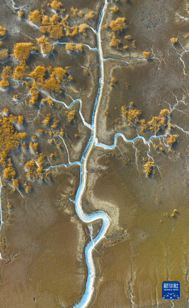 近日,在遼寧盤(pán)錦遼河口濕地,海水在潮汐作用下涌入遼河口濕地的潮溝,并凝結成冰,從高空看去,宛若蜿蜒曲折、形態(tài)各異的“冰脈”。