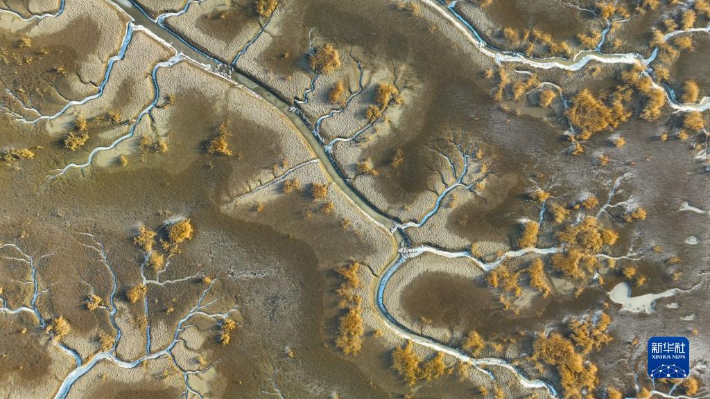 近日,在遼寧盤(pán)錦遼河口濕地,海水在潮汐作用下涌入遼河口濕地的潮溝,并凝結成冰,從高空看去,宛若蜿蜒曲折、形態(tài)各異的“冰脈”。
