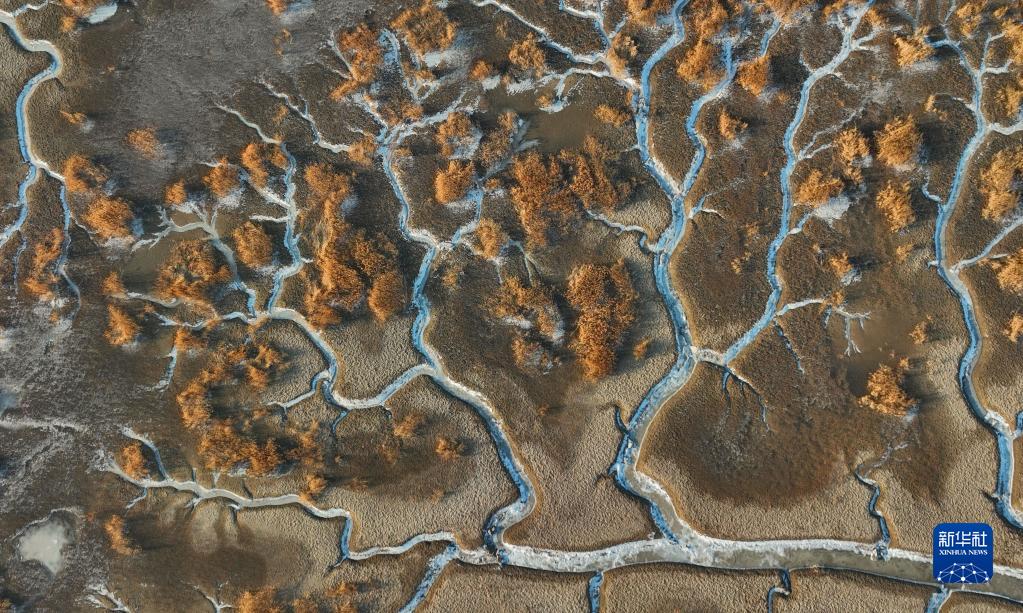 近日,在遼寧盤(pán)錦遼河口濕地,海水在潮汐作用下涌入遼河口濕地的潮溝,并凝結成冰,從高空看去,宛若蜿蜒曲折、形態(tài)各異的“冰脈”。