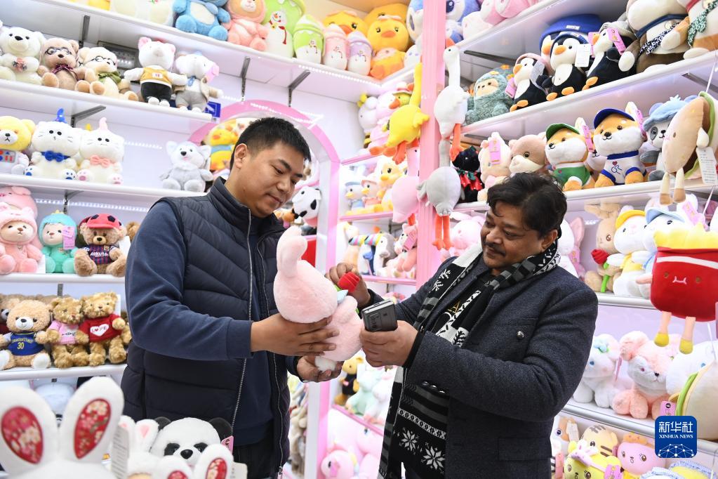 2月2日,來(lái)自印度的客商拉賈(右)在義烏國際商貿城的一家玩具店鋪內選購。