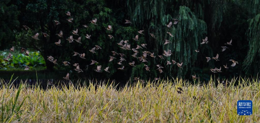 廣州海珠濕地稻田里的斑文鳥(niǎo)(2020年7月25日攝)。