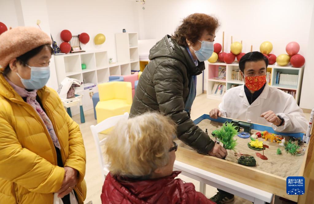 2月2日,一位心理醫生(右)在沙盤(pán)游戲中協(xié)助居民選取道具。