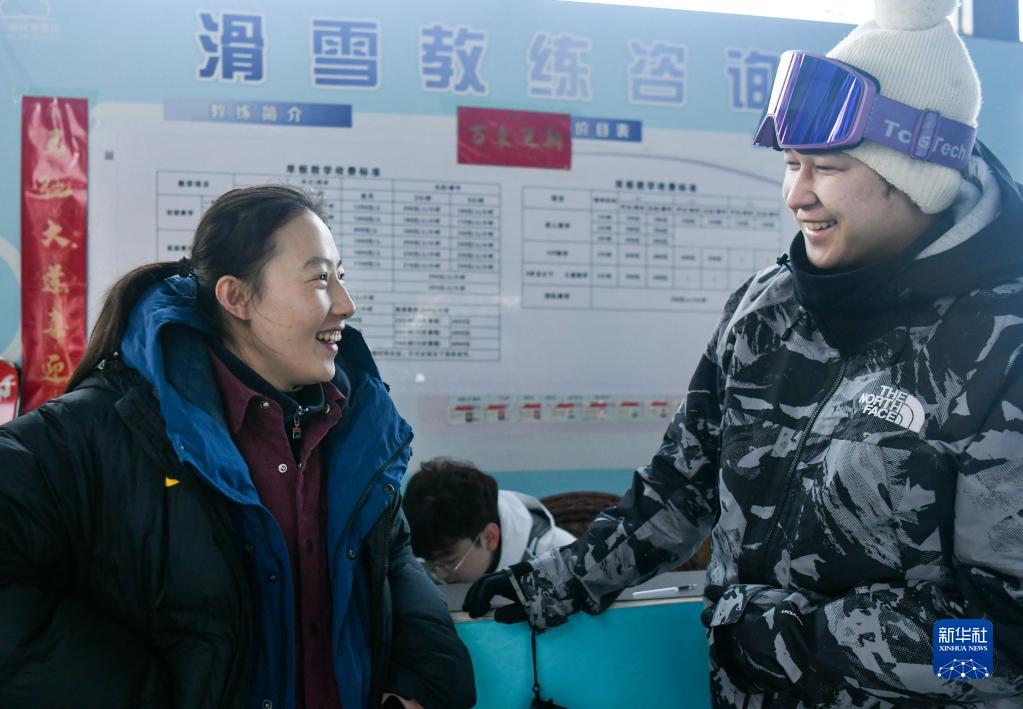 在新疆白云國際滑雪場(chǎng),許秀娟(左)和把爾斯·木拉提在工作間隙交流(1月26日攝)。
