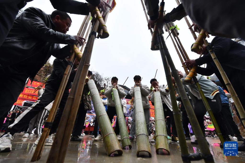 2月2日,融水苗族自治縣桿洞鄉黨鳩村苗族同胞在吹蘆笙。