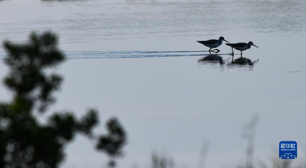 兩只青腳鷸在海南東寨港國家級自然保護區內覓食(1月30日攝)。