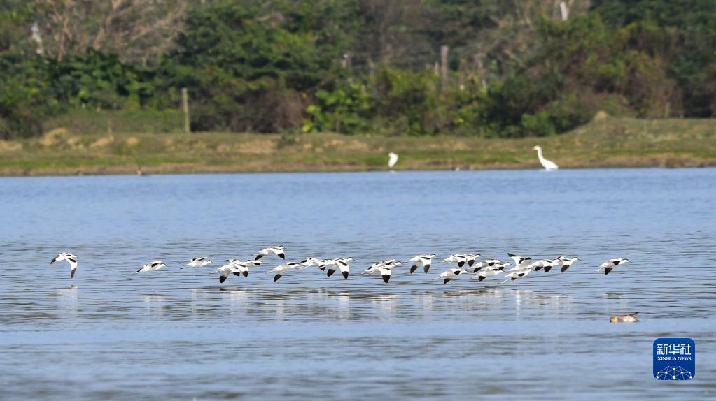 一群反嘴鷸在海南東寨港國家級自然保護區內飛翔(1月30日攝)。