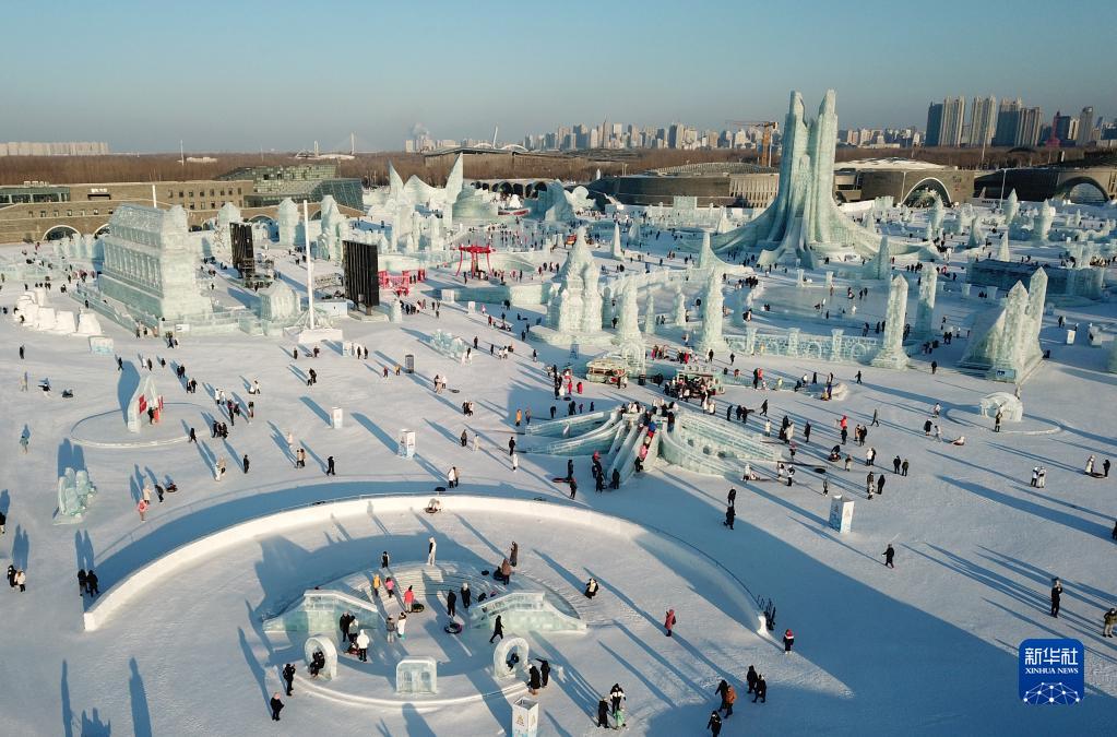 2月2日,游客在哈爾濱冰雪大世界園區內游玩(無(wú)人機照片)。