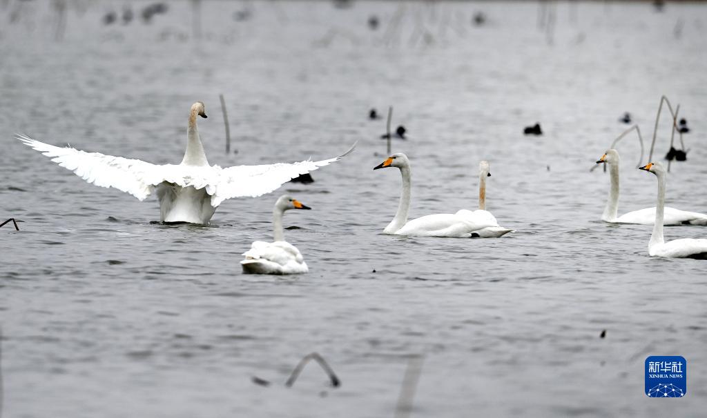 2月2日,一群白天鵝在陜西省合陽(yáng)縣黃河濕地嬉戲覓食。