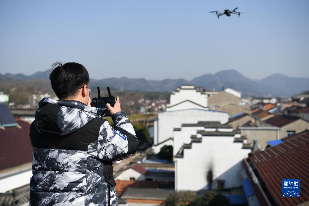 1月30日,郭昊在安徽省六安市舒城縣湯池鎮利用無(wú)人機航拍器拍攝小鎮風(fēng)景。