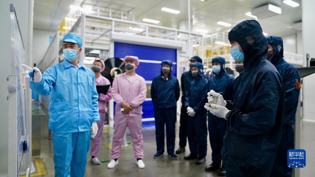 江西國軒新能源科技有限公司實(shí)習員工周詩(shī)航(右一)在廠(chǎng)房?jì)葏⒓油坎驾伔謱?zhuān)項會(huì )議(2月2日攝)。