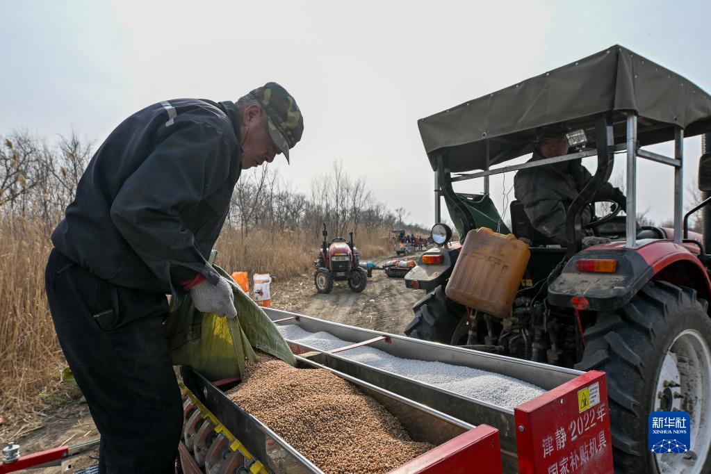2月2日,工人在位于天津市靜海區蔡公莊鎮的天津市農業(yè)科學(xué)院農作物研究所示范基地向機器內裝填春小麥原種。