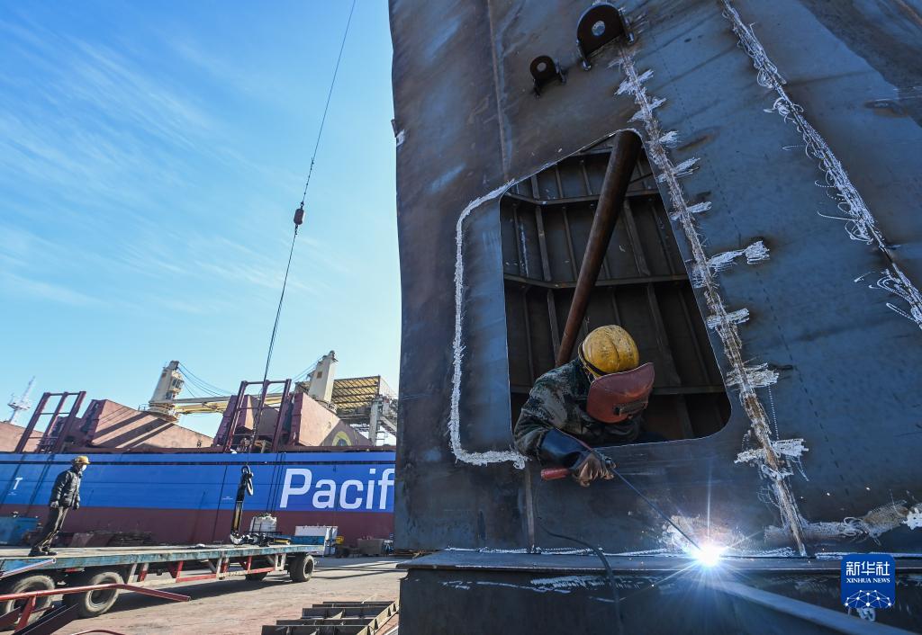 萬(wàn)邦船舶重工(舟山)有限公司的工作人員正在進(jìn)行電焊作業(yè)(1月31日攝)。春節期間,位于舟山市普陀區小干島的萬(wàn)邦船舶重工(舟山)有限公司的沿海岸線(xiàn)碼頭上排滿(mǎn)等待修理的船舶,一臺臺高空作業(yè)平臺車(chē)環(huán)繞著(zhù)萬(wàn)噸巨輪加緊運轉作業(yè),一季度訂單已經(jīng)全部排滿(mǎn)。