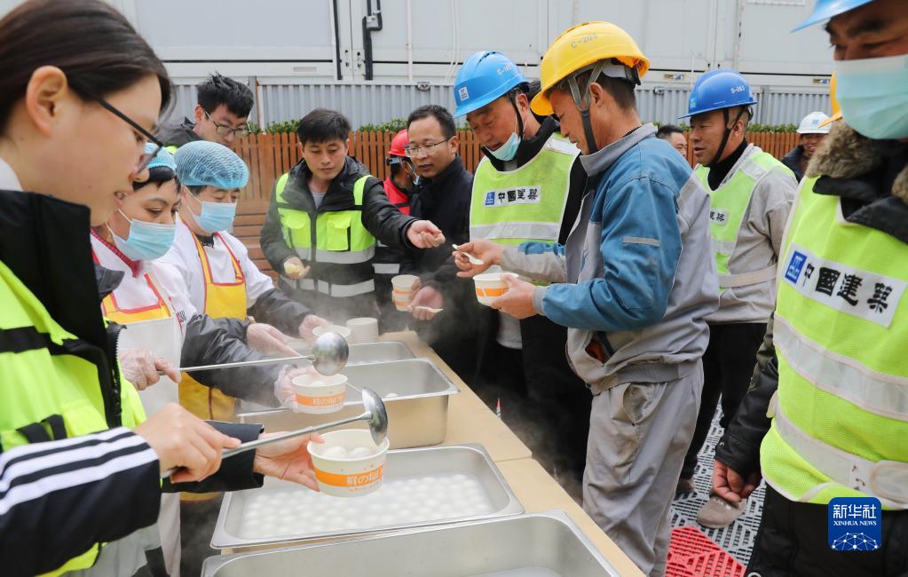 2月3日,在上海楊浦區的中建八局中節能項目工地,項目青年員工與楊浦區大橋街道志愿者為工友們盛湯圓。