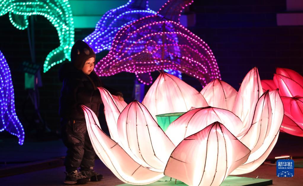 2月3日,一位小朋友在營(yíng)口遼河老街的蓮花形花燈前游玩。