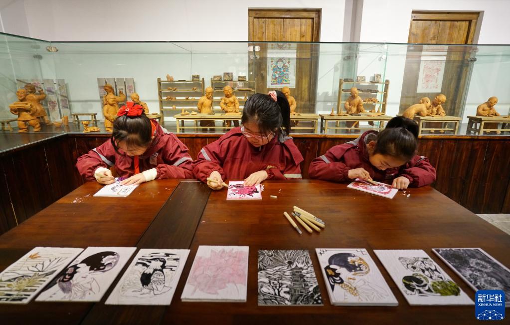 2月3日,小朋友們在武強年畫(huà)博物館練習制作木版年畫(huà)。
