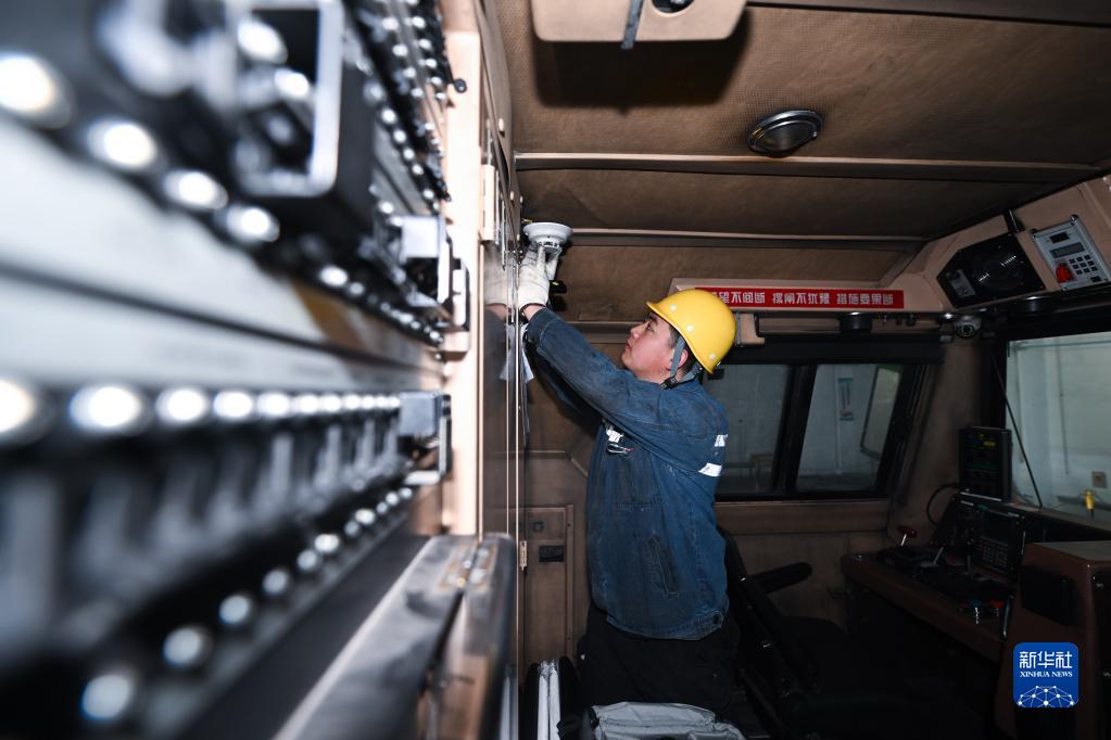 2月4日,在格爾木機務(wù)段檢修車(chē)間,馬國仁在駕駛室檢查。