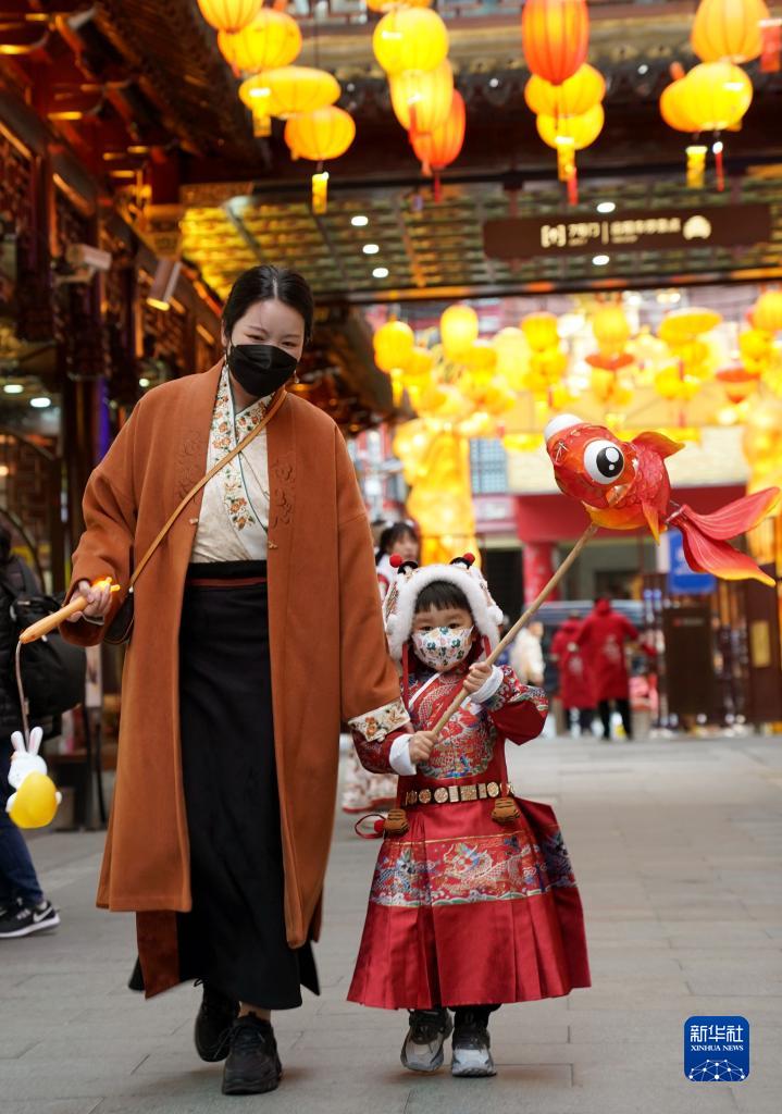 2月3日,一名小朋友舉著(zhù)花燈和媽媽一起逛豫園。