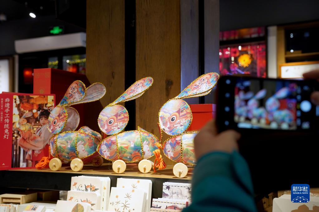 2月3日在豫園文創(chuàng )商店拍攝的傳統手工兔子燈。
