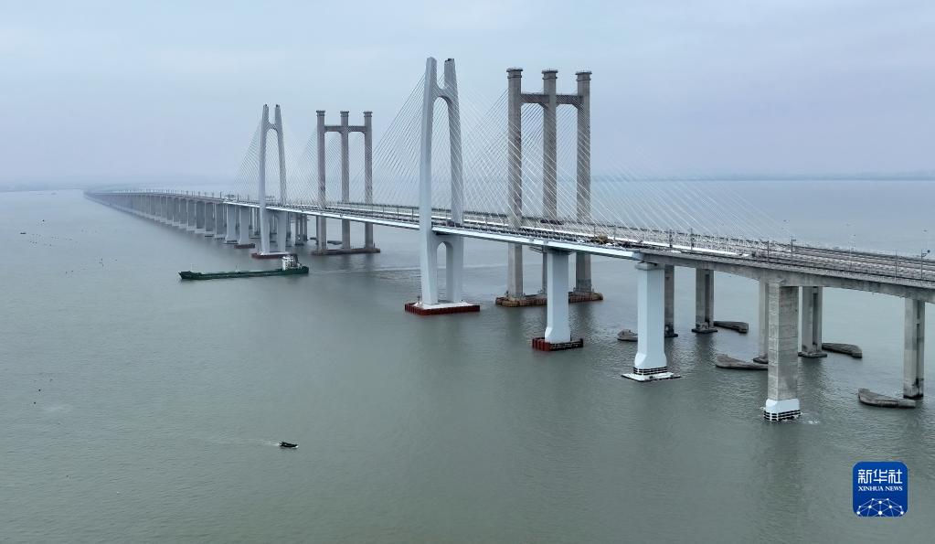 這是2月4日拍攝的新建福廈鐵路泉州灣跨海大橋(無(wú)人機照片)。