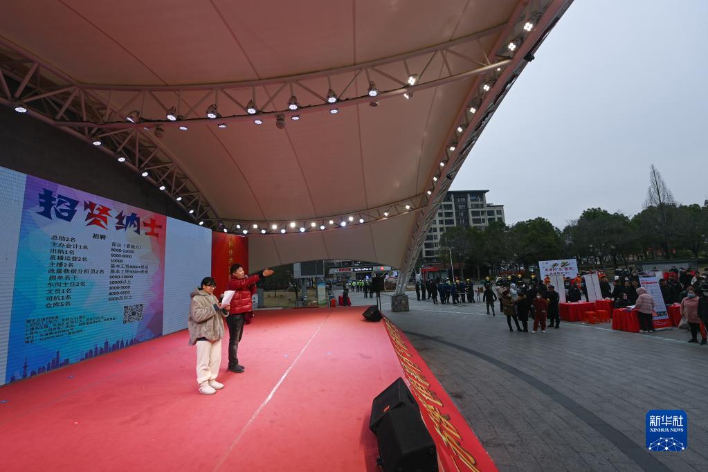 2月4日,企業(yè)工作人員在招聘會(huì )現場(chǎng)上臺路演,介紹企業(yè)的概況和招聘需求。