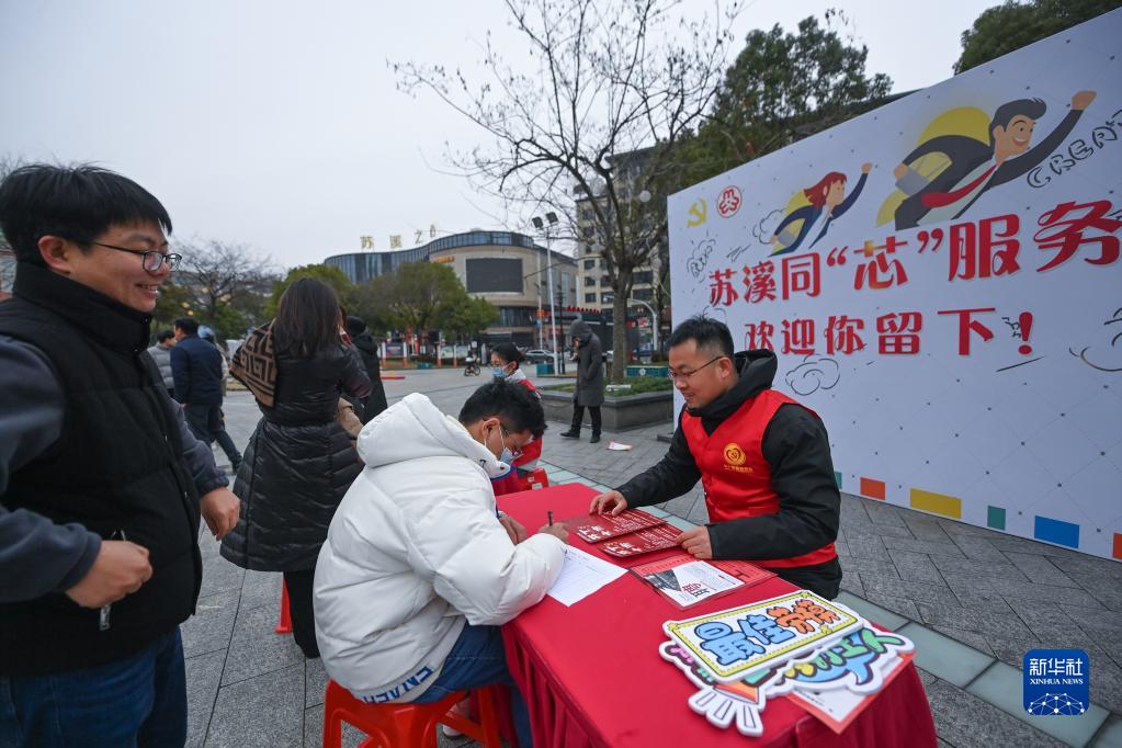 2月4日,在招聘會(huì )的同“芯”服務(wù)臺,黨員志愿者(右一)為求職者登記信息。當天在現場(chǎng)未找到合適工作的求職者可以留下自己的求職意向,黨員志愿者將根據求職者需要,依托黨建“同心圓”,幫助其與本地企業(yè)進(jìn)行精準對接。