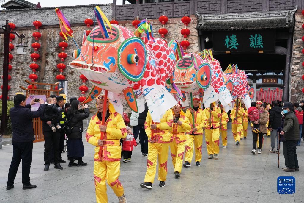 2月4日,民間藝人在安徽歙縣古城表演瞻淇魚(yú)燈。