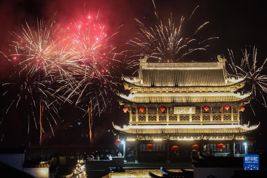 2月4日,浙江省建德市梅城鎮嚴州古城的澄清門(mén)上空焰火綻放(無(wú)人機照片)。