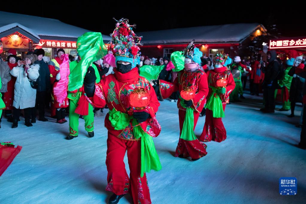 2月4日,秧歌隊在位于黑龍江省牡丹江市的大海林林業(yè)局有限公司雙峰林場(chǎng)雪鄉景區內表演。