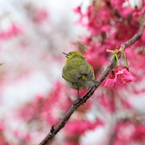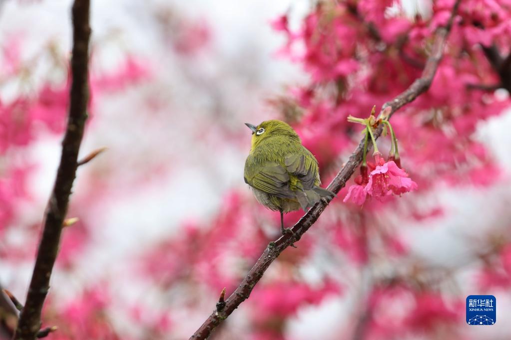 2月4日,在廈門(mén)市翔安區妙高山一處生態(tài)茶園,一只繡眼鳥(niǎo)在櫻花枝頭上小憩。