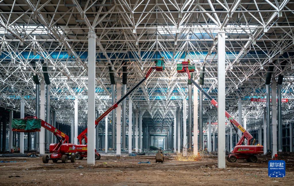 工作人員在奧迪一汽新能源汽車(chē)項目建設現場(chǎng)進(jìn)行施工作業(yè)(1月31日攝)。