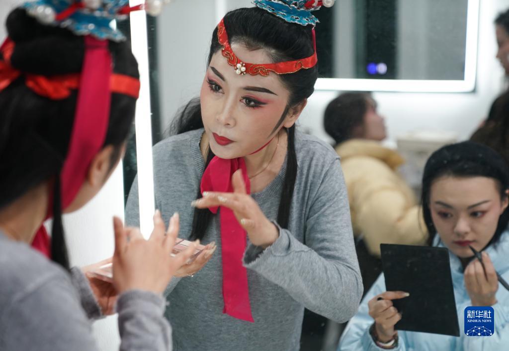 2月4日,在盱眙縣江淮劇場(chǎng),演員演出前化裝。