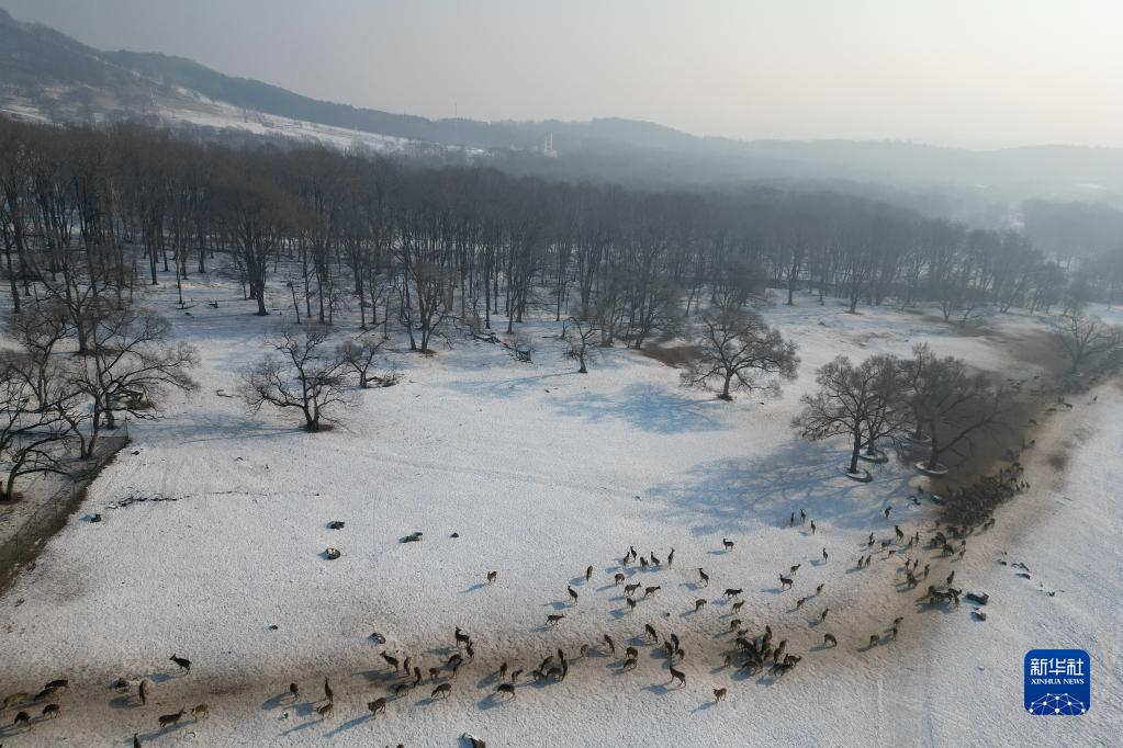 2月4日,一群梅花鹿在中國龍江森林工業(yè)集團有限公司平山皇家鹿苑內覓食(無(wú)人機照片)。