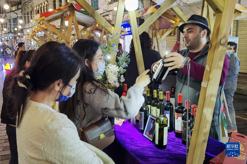 2月3日,格魯吉亞攤主在??隍T樓老街售賣(mài)本國特色商品。