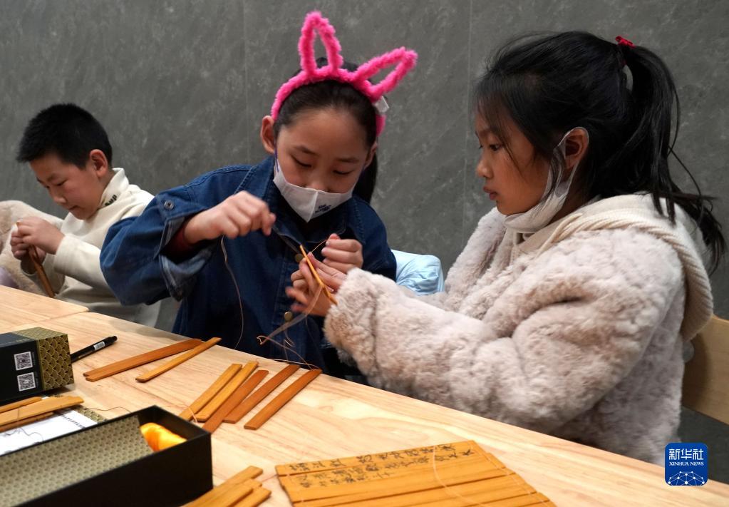 2月4日,小朋友在中國文字博物館體驗竹簡(jiǎn)制作。