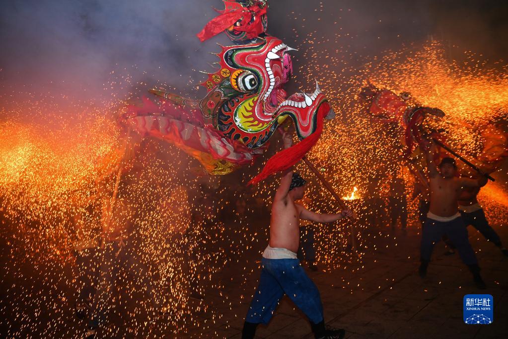 2月4日,在湖南省湘西土家族苗族自治州保靖縣宏一藍泊灣廣場(chǎng),民間藝人表演鋼火燒龍。