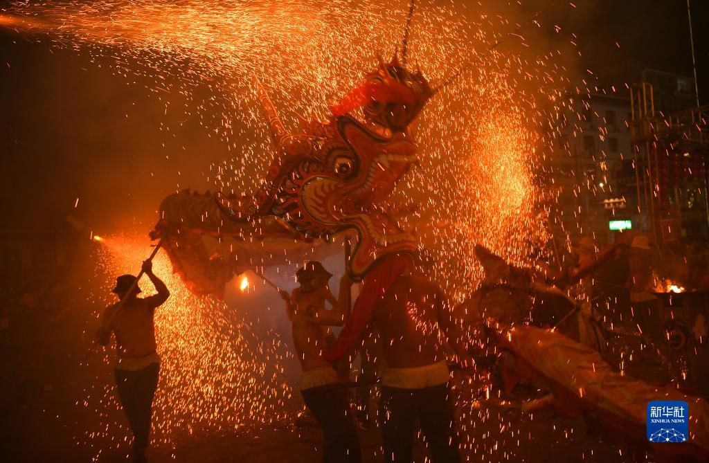 2月4日,在湖南省湘西土家族苗族自治州保靖縣宏一藍泊灣廣場(chǎng),民間藝人表演鋼火燒龍。