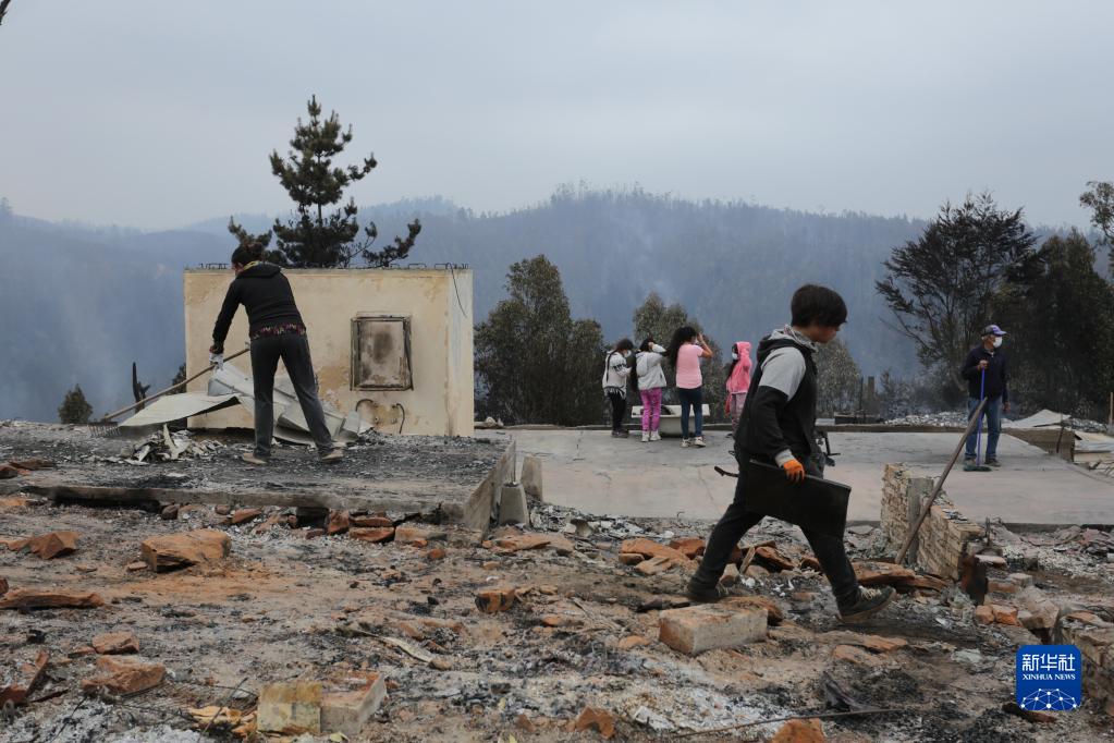 2月4日,在智利比奧比奧大區康塞普西翁,居民在火災后清理廢墟。
