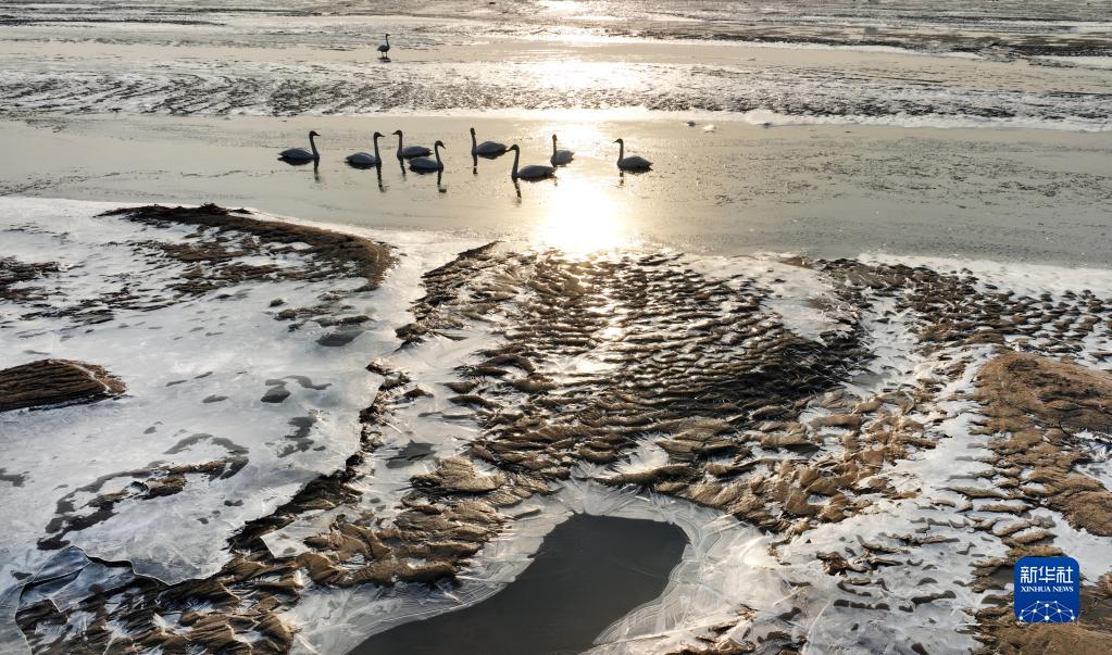 2月3日,黃河西岸的合陽(yáng)黃河濕地自然保護區內,天鵝在沐浴春光(無(wú)人機照片)。